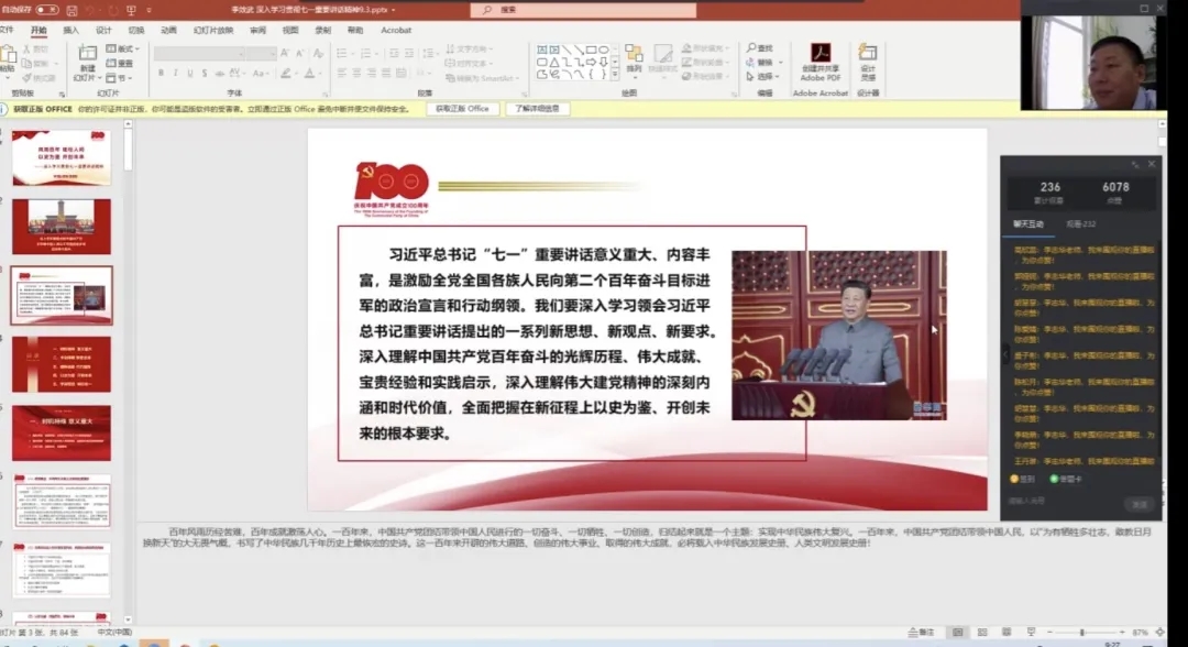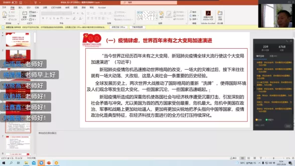 李书记结合教育的概念和当前疫情局势的情况下带领全体新生共同学习习近平总书记“七一”重要讲话,并且积极鼓励同学们要及时响应国家号召,把个人的理想融入国家伟大建设事业中,为党,为社会多做自己的贡献,让青春美好的瞬间盛开在祖国各处。