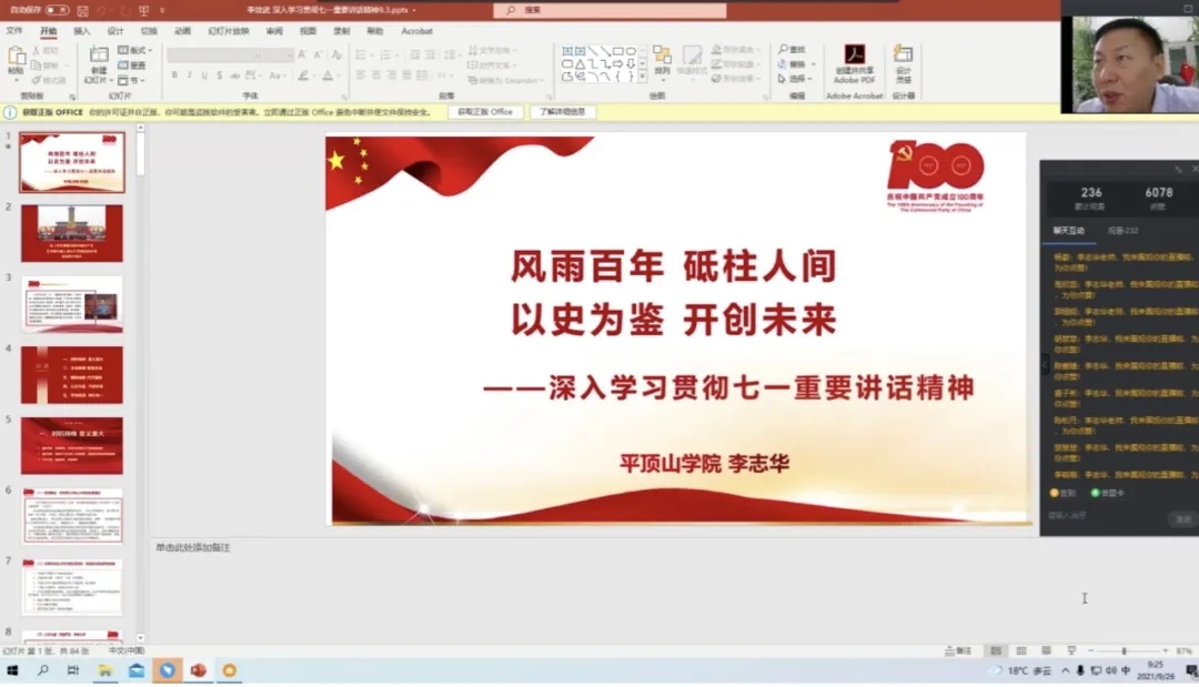 会议上,李书记以“风雨百年 砥柱人间 以史为鉴 开创未来——深入学习贯彻七一重要讲话”为题,围绕“时机特殊 意义重大”“丰功伟绩 恢弘史诗”“精神血脉 代代相传”“以史为鉴 开创未来”“学深悟透 知行合一”五个方面来给21级新生进行讲解。在会议的最后,李书记对即将进入大学校园的新生们寄予嘱托与厚望,希望他们将自己的学习生活与国家民族紧密结合起来,充实地过好大学生活,取得满意的成绩,实现人生价值。