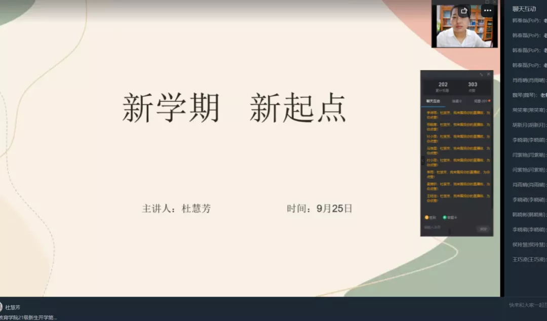 9月25日,太阳成集团tyc972821级新生开学第一课在钉钉上举行,由21级新生辅导员杜慧芳老师主讲。此次开学第一课主要围绕“新学期,新起点”的主题展开,共有四个方面:学校简介、学院简介、如何适应大学生活、开学准备工作。