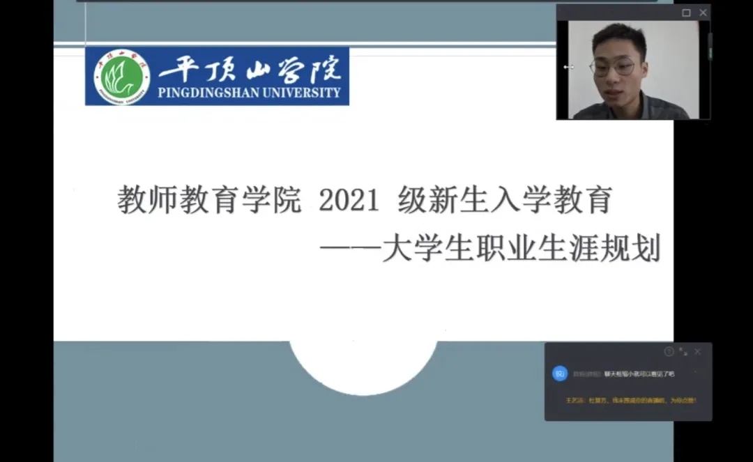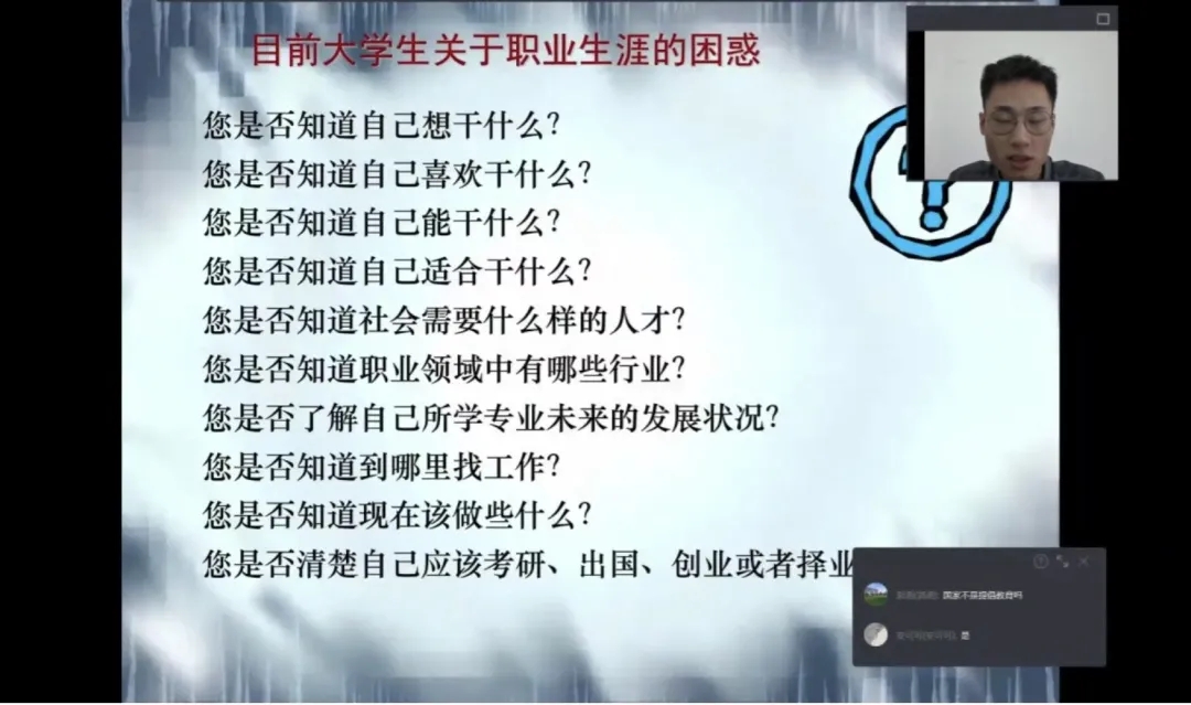 为了让21级新生对未来职业走向和职业发展有更清晰的认识,太阳成官网于9月29日面向全体21级新生组织开展“职业生涯规划”线上主题课堂。本次课堂由太阳成集团tyc9728辅导员李世尧老师主讲。李老师将本次课堂划分为三大块:什么是职业生涯规划、为什么要做职业生涯规划、怎样做生涯规划三大部分,带领同学们更好地认识和了解大学生职业生涯规划。