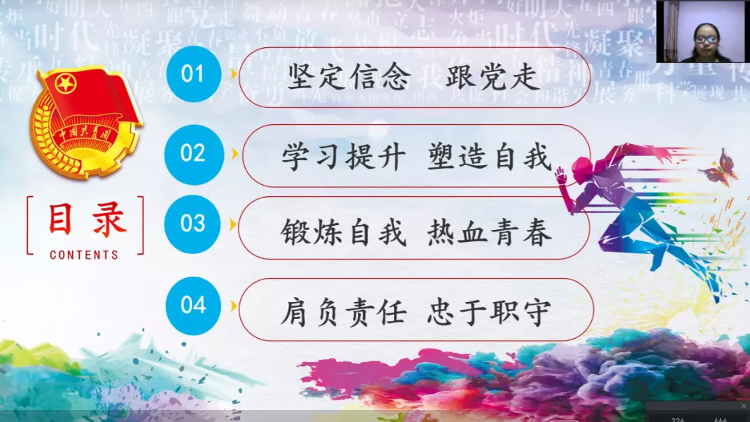 首先,霍姗姗学姐进行了简单的自我介绍,随后从坚定信念跟党走、学习提升 塑造自我、锻炼自我 热血青春、肩负责任 忠于职守四个方面展开分享。