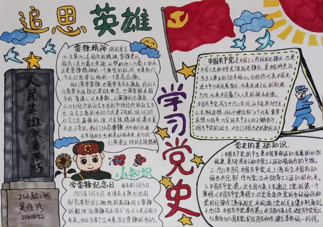 同学们以红色党史故事为主题,回顾党成立以来各个伟大时期的革命先烈,细心的用画笔描绘出每一个精彩瞬间,列举自己心中的革命英雄,将我们对先烈们的怀念与敬仰之情倾注于作品之间中。作品虽然简单,但是对党和国家的爱却明亮又炙热。