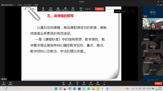 李慧转校长首先介绍了说课的概念、类型、模式、内容与方法等几方面问题,然后对说课的“四说模式”进行了重点介绍。她指出在说课前一定要做好教学设计准备工作,需要对教学目标、教材处理、教学方式、教学理念作出分析。她还结合具体教学案例将自己多年的教学经验已经方法讲述给同学们。同学们认真听讲,认真做笔记,受益匪浅。
