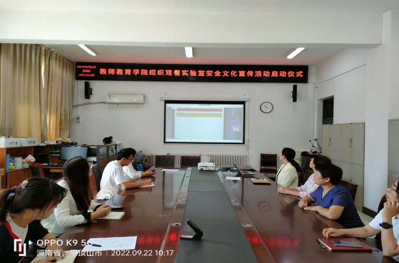 为了深入贯彻习总书记、李克强总理等党中央、国务院领导通知关于科技安全与加强安全生产的主要指示精神。结合教育部《教育部办公厅关于开展加强高校实验室安全专项行动的通知》中关于实验室准入制度及将实验室安全教育纳入学生培养环节中的要求,按照河南省高校实验室工作研究部署,开展为期一个月的安全文化宣传活动。2022年9月22日上午,太阳成官网书记和主管实验室的院长带领师生30余人在A226共同收看了开幕式。