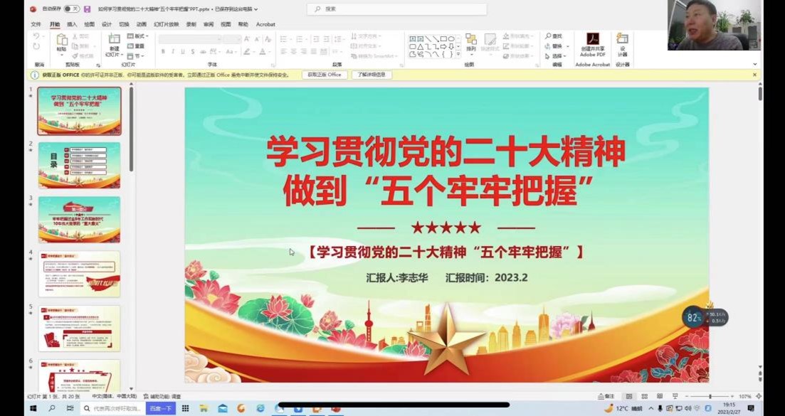 2023年2月27日晚,李志华书记以线上直播的形式对本院的大一、大二五百余位同学进行了新学期开学第一课教育。课中,李志华书记以2022年召开的党的二十大为主题,以如何学习贯彻党的二十大精神为中心,以如何做到“五个牢牢把握”为章节,让同学们对于学习党的二十大精神又有了新的认识和理解。
