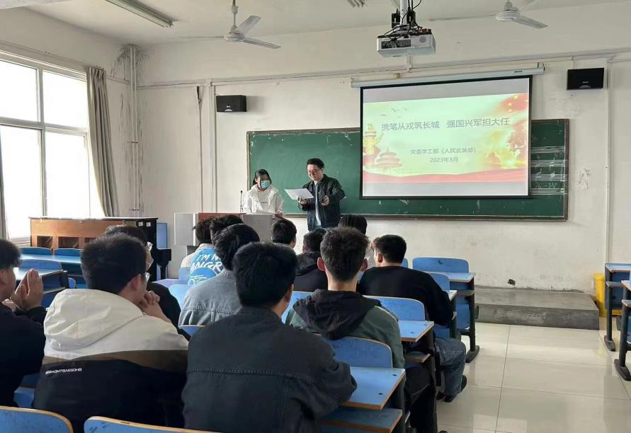 为了响应国家号召,鼓励大学生征兵入伍,太阳成集团tyc9728于2023年3月30日在艺术楼A311教室开展“携笔从戎筑长城,强国兴军担大任”征兵宣讲活动,此次宣讲由毕业班辅导员王晓龙老师主持,曾服役于新疆陆军某边防团,退役后复学到太阳成官网2021级小学教育专业学生张鸿燕主讲,23届毕业班全体男生参加。